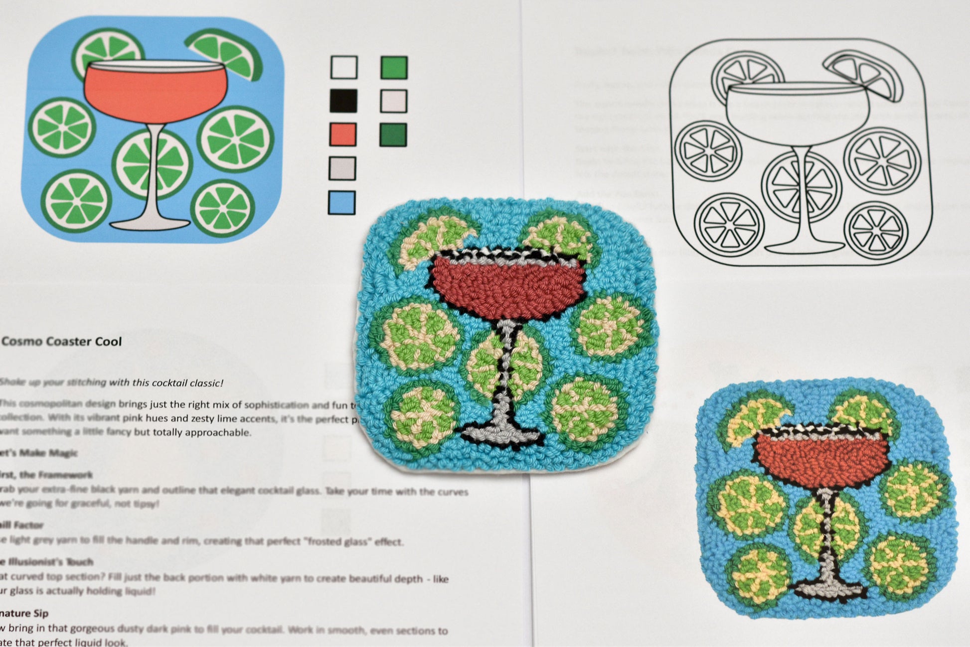 “Bar Chart Daydream” is a digital embroidery pattern collection celebrating peaceful moments, refreshing drinks, and the quiet joy of making something by hand. Each of the 10 original coaster designs is inspired by a different beverage—from a foamy beer mug to a cherry cooler, a margarita to a rich glass of red wine—all crafted to reflect the charm and character of your favorite pours.